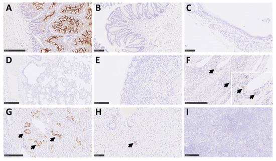 The expression patterns of two key host factors, ACE2 and TMPRSS2, were assessed in respiratory and non-respiratory tissues. For ACE2, intense staining was observed in the apical border of the small intestine absorptive epithelium (Figure 7A). Mild staining was observed in glandular epithelial cells from the small intestine. The staining in the large intestine was minimal (Figure 7B) and was almost absent in the trachea, lung, and nasal cavity (Figure 7C–E), compared to a moderate positive reaction in these tissues from rhesus macaque positive control sections (Supplementary Figure S1B). There was moderate staining in the glandular epithelium within the olfactory mucosa area of the nasal cavity (Figure 7F); however, staining was absent in the epithelium lining and nerve terminations. Intense staining was also observed within the tubular epithelial cells of the kidney and was mostly within the apical border (Figure 7G). Mild to moderate staining was observed in immune cells present in the liver (mostly within EMH foci) (Figure 7H) and there was no staining in the spleen, thymus, or brain (Figure 7I). For TMPRSS2, a strong reaction was observed in the small and large intestine (Figure 8A,B), mostly within immune cells within the mucosa, but also in the absorptive epithelial cells and smooth muscle cells. Positive staining was also observed within smooth muscle layers of the oesophagus (Figure 8C). Strong staining was observed in some airway epithelial cells in the lung, with less intensity in the alveoli and inter alveolar septa (Figure 8D). In the larger airways and upper respiratory tract (bronchi and trachea), moderate staining was also observed within the respiratory epithelium and lamina propria (Figure 8E,F). Levels of TMPRSS2 staining were comparable to tissue samples from experimentally infected rhesus macaques used as positive controls (Supplementary Figure S1C).