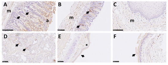 Representative images of IHC for TMPRSS2 in marmoset tissues. Strong reaction was observed in the small (Bar = 250 µm) (A) and large intestine (Bar = 100 µm) (B), mostly within immune cells within the mucosa (arrows), but also absorptive epithelial cells (a), smooth muscle (m), and few blood vessels. The staining within smooth muscle (m) can also be observed within the oesophagus (Bar = 100 µm) (C). Strong positive staining was also observed in some airway epithelial cells in the lung parenchyma (Bar = 100 µm) (D) (arrows), with less intensity in the alveoli and septa. In larger airways and upper respiratory tract (bronchi (Bar = 100 µm) (E) and trachea (Bar = 250 µm) (F)), moderate positivity can also be observed within the respiratory epithelium (arrows) and lamina propria (*).