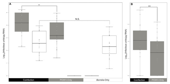 (A) POWV (gray) and B. burgdorferi (white) quantities detected in the midguts of capillary-inoculated ticks as determined by qPCR quantification. Statistically significant comparisons are marked with “**” for p-values less than 0.01, and N.S. for p-values greater than 0.05. A statistically significant increase in POWV (p = 0.009) was observed between the POWV-only group (n = 33) and simultaneously coinfected groups (n = 17). No statistically significant chance in B. burgdorferi (p = 0.464) was observed between the coinfected and Borrelia-only group (n = 20). (B) POWV observed in the salivary glands of POWV-only (n = 33) and coinfected (n = 17) group ticks with infected midguts. The quantity of POWV in the salivary glands of all ticks with infected midguts shows a statistically significant (p = 0.008) increase in POWV quantity in coinfected salivary glands.