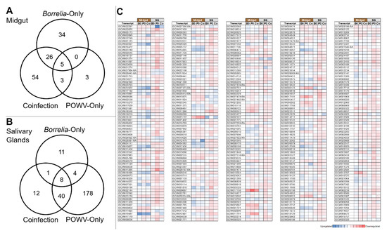 Diagrams showing the number of statistically up- or down-regulated genes from control in ticks infected with only B. burgdorferi, only POWV, or ticks infected with both, as well as genes shared between multiple categories. These include genes in the midgut (A), where the presence of POWV produces a minimal response compared to the Borrelia-only and coinfected groups, and the salivary glands of ticks with infected midguts (B), which show a strong response to POWV but a weaker response to co-infection or Borrelia-only infection. (C) Heatmap of midgut and salivary gland transcripts in response to infection with B. burgdorferi only (B0), POWV only (P0), or a combination of the two pathogens (Co). All transcripts in the represented in the heatmap were significantly altered (p < 0.05) from control expression in the co-infection category. All transcripts were significantly altered (p < 0.05) from control expression in the co-infection category.