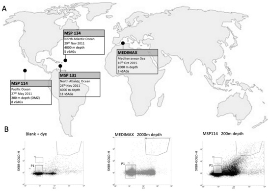 (A) Sampling information map. Location, date, depth and number of viral single amplified genomes (vSAGs) are indicated for each sampling point. (B) Flow cytometry sorting plots and gates for blanks (left panel; SYBR Gold-stained buffer TE), 2000 m depth MEDIMAX (middle panel), and MSP114 200 m depth (right panel; OMZ) samples. P1 gate, which shows the viral population, was employed to sort the single viruses employed in this study.