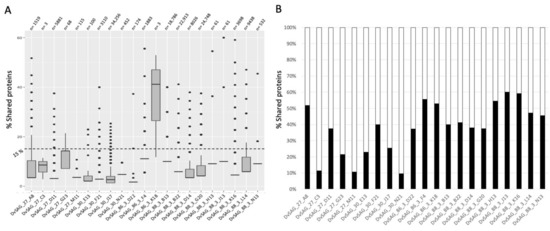 To identify confident viral contigs, the viral sequence identification standard operating procedure (SOP) with VirSorter2 V.2 from protocols.io (https://dx.doi.org/10.17504/protocols.io.btv8nn9w (accessed on 10 May 2022)) was employed, combining VirSorter2, CheckV, and DRAMv, following the standard procedure for all the assembled contigs longer than 2500 bp. Annotated proteins from the identified viral contigs were compared with the IMG/VR database v3, containing the proteins from 2,332,702 viral genomes, using BLASTP with a cutoff of amino acid similarity >80% and query coverage >90%. Additionally, to detect the presence of similar viruses within the novel vSAGs, all these proteins were compared in an all-versus-all protein BLASTP, using the same above-described BLASTP cutoffs.