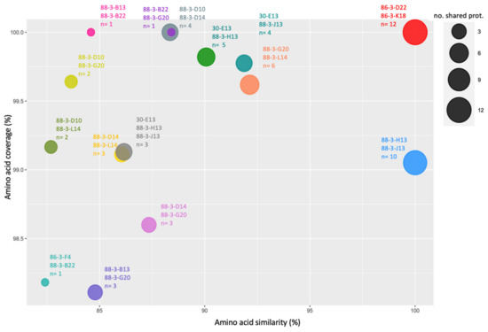 Shared proteins between vSAGs. Each circle represents two (or three) vSAGs sharing at least one protein. The area of the circle is related with the number of shared proteins.