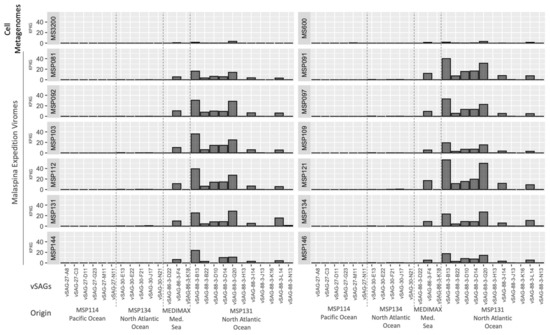 To analyze the abundance of the vSAGs in the global deep-ocean virosphere, we performed a metagenomic and viromic fragment recruitment, using metagenomes from the deep Mediterranean Sea (600 and 3200 m depth) [22] and from the Malaspina expedition [6]. A nucleotide identity cutoff ≥80% was employed to target similar viruses, putatively within the same genus [10,18]. A homogeneous profile of relative abundance of analyzed vSAGs was observed in the different deep-ocean viromes (Figure 4). Overall, those vSAGs obtained from the North Atlantic (station MSP131) were the most abundant, and in particular, vSAG 88-3-B13 and 88-3-G20 obtained the highest recruitment rates in all analyzed viromes (Figure 4). This higher abundance of both viruses was also observed in the two Mediterranean Sea metagenomes used in this analysis, although significantly lower abundance values for all the vSAGs were observed in these cell metagenomes.