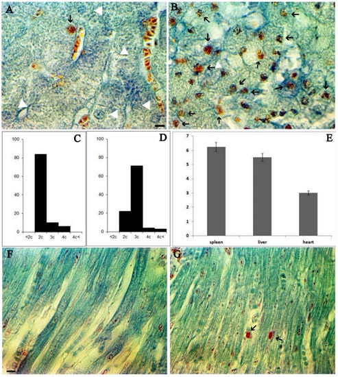 Similar processes occur in quiescent cells in non-proliferating tissues, such as cardiomyocytes (Figure 1F healthy heart section; Figure 1G porcine heart of third-day post infection).