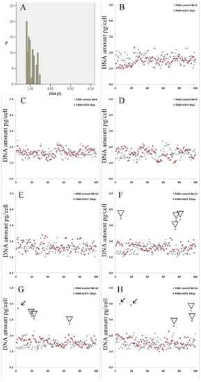 Dynamics of nuclear DNA synthesis in ASFV infected PAM. (A). DNA histograms of the intact PAMs. (B). DNA amount per cell in pictogram in control and under the ASFV infection (3 hpi). (C). DNA amount per cell in pictogram in control and following the ASFV infection (6 hpi). (D). DNA amount per cell in pictogram in control and following the ASFV infection (8 hpi). (E). DNA amount per cell in pictogram in control and following the ASFV infection (10 hpi). (F). DNA amount per cell in pictogram in control and following the ASFV infection (12 hpi). (G). DNA amount per cell in pictogram in control and following the ASFV infection (14 hpi). (H). DNA amount per cell in pictogram in control and following the ASFV infection (16 hpi). Cells with DNA proliferation in S (marked with triangle) and G2 phase of the cell cycle (marked with arrow).