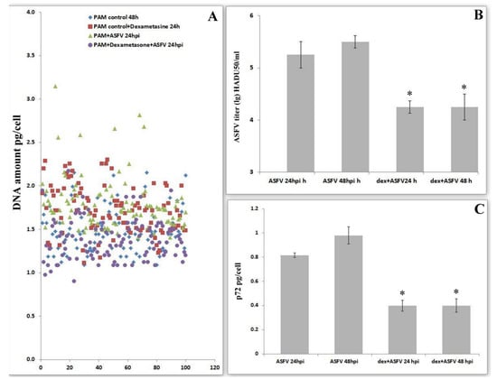 Effects of dexamethasone on the amount of DNA and the replication activity of the ASF virus. (A). DNA amount per cell in pictogram in control cells, after dexamethasone treatment and the ASFV infection 24 hpi. (B). Effects of dexamethasone on ASFV titers after 24 hpi in PAM; * significant compared to standard infection (p < 0.05) (mean ± SD). (C). Effects of dexamethasone on ASFV p72 after 24 hpi in PAM; * significant compared to standard infection (p < 0.05) (mean ± SD).
