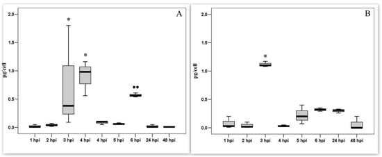 Cyclin A and cyclin E levels in PAM lysates in dynamics of ASFV infection. (A). Cyclin A levels in PAM lysates; (mean ± SD); * significant compared to all other measurements (p < 0.01–0.05); ** tendency (p < 0.1). (B). Cyclin E levels in PAM lysates; * significant compared to all other measurements (p < 0.01) (mean ± SD).