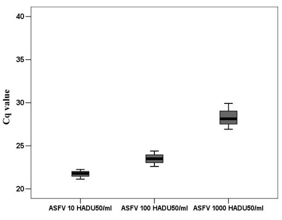The Cq values of ASFV DNA corresponded to 100, 1000, and 10,000 HADU50/mL.