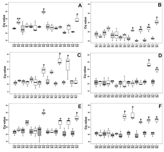 Quantitative real-time PCR results of ASFV K196R, R298L, A2410L, F778R, F334L and E165R mRNA (cDNA) in ASFV infected PAM lysates. (A). ASFV thymidine kinase mRNA (K196R) levels in infected PAM in dynamics of viral infection; * significant compared to all another measurements (p < 0.01). (B). ASFV serine/threonine protein kinase mRNA (R298L) levels in infected PAM in dynamics of viral infection * significant compared DNA levels (p < 0.05–p < 0.01). (C). ASFV thymidylate kinase mRNA (A240L) levels in infected PAM in dynamics of viral infection * significant compared DNA levels (p < 0.05–p < 0.01). (D). ASFV ribonucleoside-diphosphate reductase mRNA large subunit (F778R) levels in infected PAM in dynamics of viral infection * significant compared DNA levels (p < 0.05–p < 0.01). (E). ASFV ribonucleoside-diphosphate reductase mRNA small subunit (F334L) levels in infected PAM in dynamics of viral infection * significant compared DNA levels (p < 0.05–p < 0.01); ** tendency (p < 0.1). (F). ASFV dUTP nucleotidohydrolase (dUTPase) mRNA (E165R) levels in infected PAM in dynamics of viral infection * significant compared DNA levels. White boxplots are cDNA and gray boxplots are DNA. DNA and cDNA amounts are graphed on the x-axis. Cq values are graphed on the y-axis.