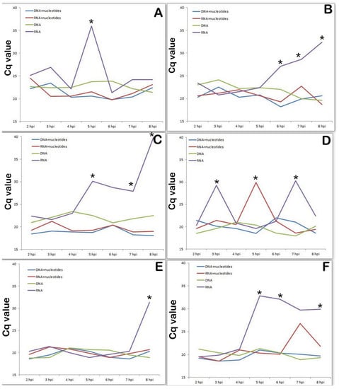 For alignment of the cDNA plots, Cq values were rescaled after comparing with viral genome copies amounts and modified in absolute amounts along the y-axis for better visualization.