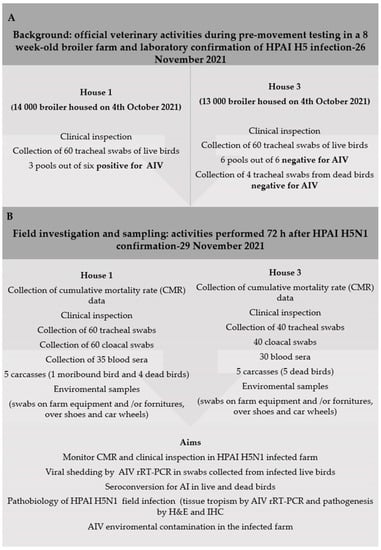 (A) Background of H5N1 HPAIV confirmation during the pre-movement monitoring performed by official veterinary authorities in the broiler farm. (B) Field activities carried out in the two houses of the affected holding for this study. AIV, Avian Influenza Virus; CMR, cumulative mortality rate; r-RT-PCR, Real-Time RT-PCR; H&E, haematoxylin and eosin staining; IHC, immunohistochemistry.