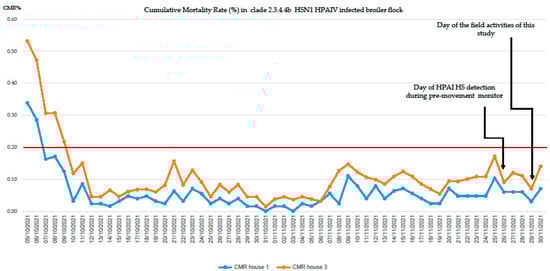 CMR, Cumulative Mortality Rate (%) of infected holding during the entire production cycle. House 1 CMR data (blue) and house 3 CMR (orange). The red bar indicates the value of 0.2% CMR-early warning of suspect AIV infection.