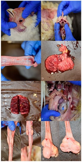 Main gross-pathology findings in infected birds of house 1. (A) Eye: moderate to severe conjunctival congestion and mild serous conjunctivitis. (B) Nasal cavities: mild hyperemia of nasal mucosa with serous debris not associated with diffuse oedema. (C) Trachea: hyperaemia, petechial haemorrhages and serous-catarrhal luminal exudation are visible on the mucosal surface. (D,E) Lungs: bilateral, moderate to severe, focally extensive to diffuse, pulmonary consolidation with edema, congestion and haemorrhages. (F) Spleen: splenomegaly with diffuse, miliary whitish spots. (G) Cecal tonsils: external (left) and cut (right) surface. Moderate hyperplasia with multifocal, red to light orange, small patches on the cut surface. (H) Bursa of Fabricius: external (left figure) and inner (right figure) surface. Moderate hyperplasia and mild mucosal oedema.
