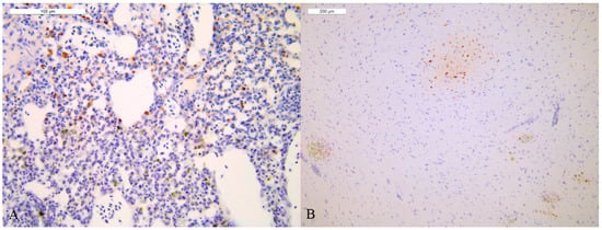 Lung and brain of one broiler of house 1 (IHC) (A) Lung: moderate number of positive pneumocytes and macrophages detected as nuclear brown staining (+++ score), (B) brain: moderate number of positive neurons and microglial cells detected as nuclear brown staining (+++ score).