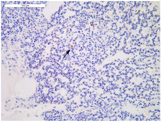 Lung of the broiler 4 of house 3 (IHC): barely/occasional presence of immunolabelled pneumocytes (black arrow) detected as nuclear brown staining (−/+ score).