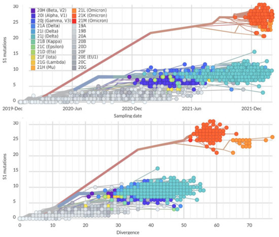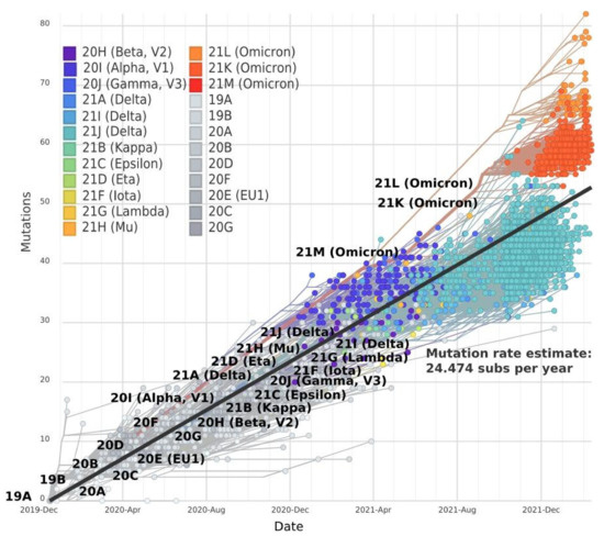 - Kandeel, M.; Mohamed, M.E.M.; Abd El-Lateef, H.M.; Venugopala, K.N.; El-Beltagi, H.S. Omicron Variant Genome Evolution and Phylogenetics. J. Med. Virol. 2021, 94, 1627–1632. [Google Scholar] [CrossRef] [PubMed]