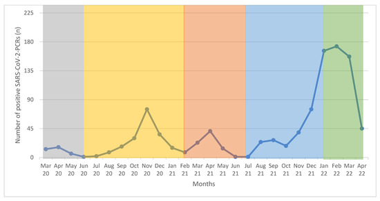 Number of positive SARS-CoV-2-NAATs between 13 March 2020 and 22 April 2022 (n = 1028): grey = first wave, yellow = second wave, red = third wave, blue = fourth wave, and green = fifth wave.