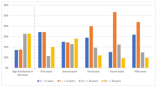 SARS-CoV-2-positive patients according to age group and wave in comparison to general age distribution in Germany [20].