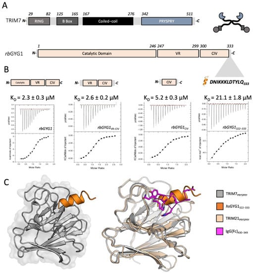 TRIM7 is a canonical TRIM protein with the same domain architecture of RING, B Box, Coiled-coil and PRYSPRY as the antiviral TRIM proteins TRIM5 and TRIM21 (Figure 1A). To understand how TRIM7 can interact with multiple diverse substrates, we initially focused on its originally reported ligand, rabbit glycogenin-1 (rbGYG1) [25]. Previously, the PRYSPRY domain was reported to be responsible for mediating binding [43], consistent with other TRIMs. Using recombinant proteins, we probed the interaction of TRIM7-PRYSPRY (PRYSPRY) with nested truncations of the rbGYG1 protein using ITC (Figure 1B). PRYSPRY clearly interacted with the full-length rbGYG1 with an affinity of 2.3 μM. This interaction was maintained in different orthologues of TRIM7 and GYG1 (Figure S1A–C). Glycogenin is an ancient enzyme found in early unicellular eukaryotes, but while the catalytic domain is highly conserved, the C-terminal sequence has undergone more recent divergence. Binding to TRIM7 was maintained when the catalytic domain was deleted, suggesting a possible regulatory relationship. The non-catalytic region could be subdivided further into a variable region (VR) that differs between classes and a C-terminal section that is relatively conserved in vertebrate subphylum (‘conserved in vertebrates’; CIV). Binding was maintained to a minimal construct comprising the CIV alone (KD = 5.2 ± 0.3 µM) but lost when this region was deleted (Figure 1B and Figure S1D,E). Structural prediction of the CIV region suggested it contains two α-helices. We, therefore, synthesized peptides corresponding to these predicted helices and found that a peptide comprising the 12 carboxy-terminal (C-term) residues (DNIKKKLDTYLQ—rbGYG1322-333) was sufficient to maintain TRIM7 binding (Figure 1B). Co-crystallization of the PRYSPRY with the equivalent peptide from human glycogenin-1 (DNIKRKLDTYLQ—hsGYG1322-333) confirmed binding and the helical nature of the GYG322-333 epitope (Table S1, Figure 1C, left). TRIM7 binding takes place at the same location within the PRYSPRY as used by TRIM21 PRYSPRY to bind its ligand, IgG Fc, further indicating that this is a specific interaction (Figure 1C, right).
