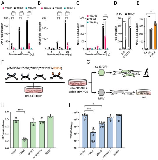 3.7. Restriction of MNV1 and CVB3 Viral Replication Is Dependent on TRIM7 Binding and Substrate Degradation but Not Its Immune Signalling Activity
