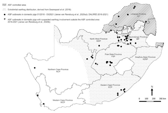 - Etter, E.M.; Mushagaluza Ciza, A.; Mapendere, C.; Ferguson, W.; Jori, F.; Penrith, M. Understanding ASF dynamic in South Africa: From spatio-temporal analysis at national level to fine special network analysis. Front. Veter. Sci. 2019, 6. [Google Scholar] [CrossRef]