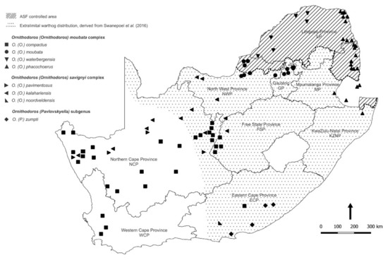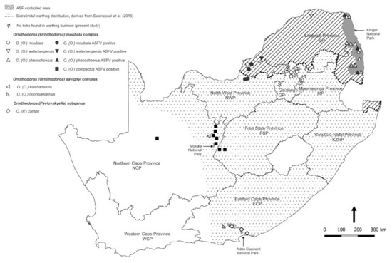 - Craig, A.F.; Heath, L.; Crafford, J.E.; Richt, J.A.; Swanepoel, R. Updated distribution and host records for the argasid tick Ornithodoros (Pavlovskyella) zumpti: A potential vector of African swine fever virus in South Africa. Onderstepoort J. Veter. Res. 2021, 88, a1960. [Google Scholar] [CrossRef] [PubMed]