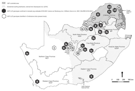 The regulations initially proved effective. However, from 2016 there were outbreaks of the disease in domestic pigs in the south that could not be linked to the recent transfer of infected animals or materials from the controlled area. The genotype of ASFV involved, genotype I, had been isolated decades earlier from outbreaks of disease in pigs, and from ticks in South Africa. The same genotype had long been associated with the disease in domestic pigs in countries of western Africa from where it is believed to have been accidentally introduced into Europe in 1957 and 1960 [6,7,8,9,10,11,12,13,14]. In South Africa, there has been widespread translocation of warthogs since 1963 to game farms and nature reserves in the south of the country, originally from a source considered to be free of ticks and virus. In 2008–2012, Ornithodoros ticks were found in warthog burrows on farms approximately 20 km south of the controlled area, including ASFV-infected ticks in one instance [15,16,17,18,19].