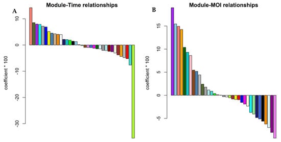 The relationships between module eigengenes and traits. The colors represent modules. (A) Correlation of module eigengenes with time course (height: coefficients × 100); (B) Correlation of module eigengenes with MOI (height: coefficients × 100); (C) Scatter plots of module eigengenes in the salmon module (for Time); (D) Scatter plots of module eigengenes in the greenyellow module; (E) Scatter plots of module eigengenes in the skyblue module; (F) Scatter plots of module eigengenes in the salmon module (for MOI); (G) Scatter plots of module eigengenes in the purple module; (H) Scatter plots of module eigengenes in the orange module.