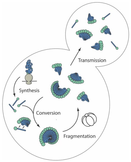 The first identified and arguably most widely studied yeast prion is [PSI+] []. The [PSI+] prion is determined by the amyloid state of the translation termination factor Sup35, which results in a partial loss of function and the associated read-through of stop codons [,], with the prion-free and fully functional form of Sup35 associated with the [psi−] state []. The emergence of a stable [PSI+] state in growing yeast cultures exists within a balanced cycle of Sup35 expression, conversion into amyloid aggregates, fragmentation of these aggregates by chaperones, and transmission of these aggregates to daughter cells at cell division to maintain both the amyloid form and sufficient Sup35 activity to support viability (see Figure 2).