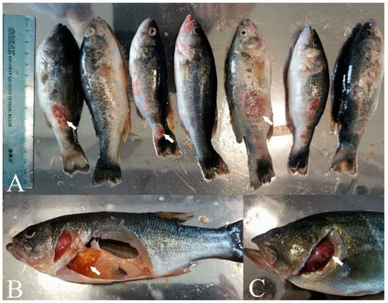 Clinical characteristics of diseased largemouth bass. (A) Ulcer lesions on the body surface (white arrows), (B) lesions in the viscera (white arrows), and (C) bleeding and necrosis lesions on the gills (white arrows).