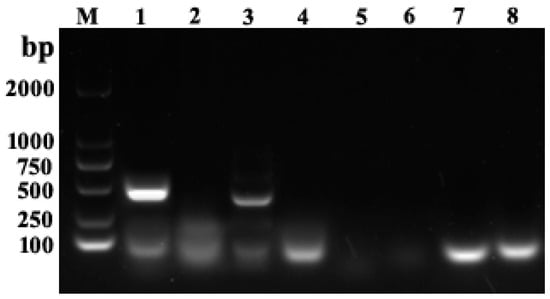 PCR amplicons used for virus detection from tissue homogenates of diseased largemouth bass. (M) A 2000 bp DNA marker, (Lane 1) LMBV detection using the tissue of diseased fish as template, (Lane 2) negative control with water as template, (Lane 3) MSRV detection using the tissue of diseased fish as template, (Lane 4) negative control with water as template, (Lane 5) NNV detection using the tissue of diseased fish as template, (Lane 6) negative control with water as template, (Lane 7) ISKNV detection using the tissue of diseased fish as template, and (Lane 8) negative control with water as template.