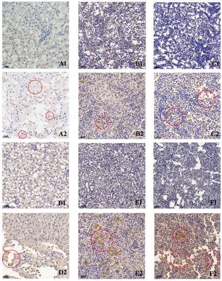Anti-LMBV and anti-MSRV polyclonal antibodies were used to detect specific viruses in tissues of diseased fish by using IHC. We found the presence of immunogenic signals for LMBV and MSRV (or similar viruses) in livers, spleens and kidneys of the diseased fish, although the liver tissues were only weakly positive (Figure 3). In general, LMBV immunogenic signals (Figure 3D2,E2,F2) were significantly greater than MSRV (Figure 3A2,B2,C2) in all three tissues. Additionally, the kidneys (Figure 3C,F2) were more immunoreactive than the livers (Figure 3A2,D2) and spleens (Figure 3B2,E2).