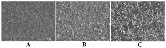 Virus isolation was performed as previously described with minor modifications [,]. The pooled tissues were thawed at 4 °C and homogenized in Dulbecco’s PBS, subjected to three freeze–thaw cycles and differentially centrifuged at 3000, 8000 and 13,000× g for 10 min each time at 4 °C, using the supernatants of the preceding spins each time. The final supernatant was filtered (0.45-μm, Millipore, Burlington, MA, USA) and diluted 1:10 in cell culture medium. MSH monolayers were grown in Corning T-25 cell culture flasks (Corning, NY, USA) and inoculated with 2 mL of 10-fold serial dilutions of the filtered supernatants. Infected and non-infected cell cultures were incubated at 28 °C and examined daily for toxicity, contamination and viral cytopathic effects (CPE). The viruses were passaged three times and virus were harvested from cultures displaying >80% CPE and stored at −80 °C for subsequent research.