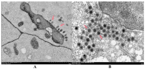 TEM analysis of infected MSH cells. All samples were prepared from the same batch and were observed using TEM, 80.0 kV. (A) Rhabdovirus-like viral particles (red arrows), and (B) iridovirus-like viral particles (red arrows).
