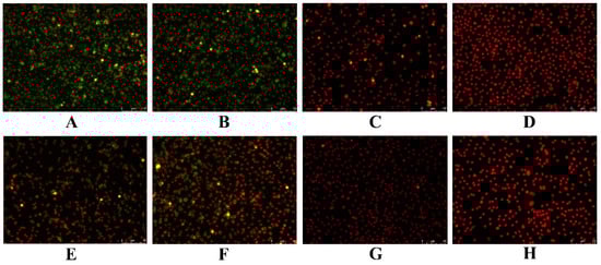 Indirect immunofluorescence assays for infected MSH cells. (A) New isolated virus infection/anti-LMBV Ab, (B) LMBV-GD202006 infection/anti-LMBV Ab, (C) LMBV-GD202006 infection/anti-MSRV Ab, (D) uninfected cells/anti-LMBV Ab, (E) New isolated virus infection/anti-MSRV Ab, (F) MSRV-GD201707 infection/anti-MSRV Ab, (G) MSRV-GD201707 infection/anti-LMBV Ab, and (H) uninfected cells/anti-MSRV Ab. The nuclei were stained red using propidium iodide (PI) solution. Bar = 10 μm.