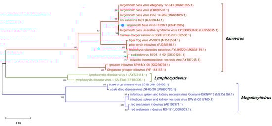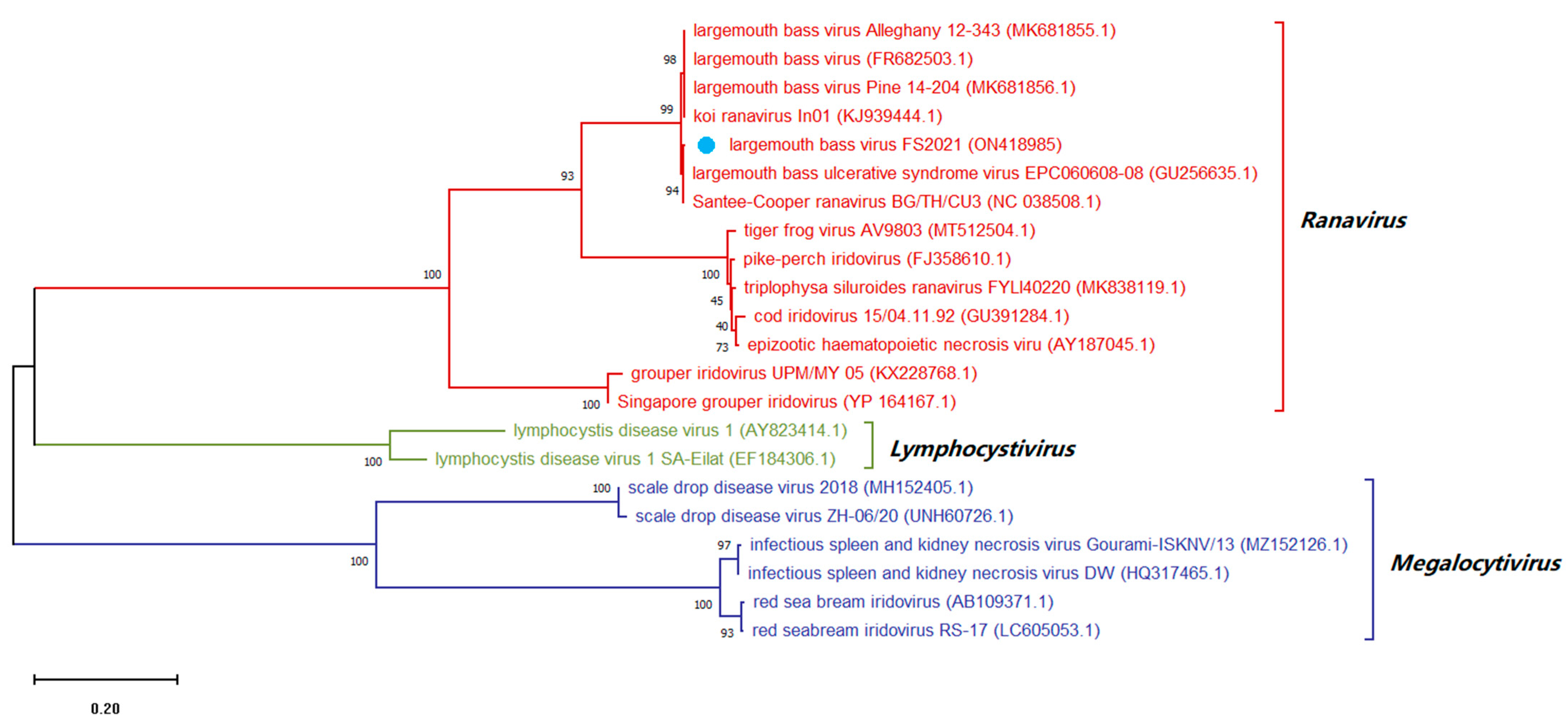 Maximum-likelihood tree of the major capsid protein (MCP protein) gene sequence of LMBV-FS2021. LMBV-FS2021 is designated by the blue dot. GenBank accession numbers are shown in brackets. The evolutionary history was inferred by using the Maximum Likelihood method and Kimura 2-parameter model. The tree with the highest log likelihood (−10532.26) is shown. The percentage of trees in which the associated taxa clustered together is shown next to the branches. Initial tree(s) for the heuristic search were obtained automatically by applying Neighbor-Join and BioNJ algorithms to a matrix of pairwise distances estimated using the Maximum Composite Likelihood (MCL) approach, and then selecting the topology with superior log likelihood value. The tree is drawn to scale, with branch lengths measured in the number of substitutions per site. This analysis involved 22 nucleotide sequences. There were a total of 1819 positions in the final dataset. Evolutionary analyses were conducted in MEGA X.