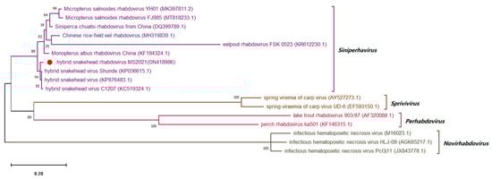 Rhabdoviruses are enveloped ssRNA with bullet-shaped virions belonging to the rhabdoviridae []. Currently, members of the rhabdoviridae are divided into three subfamilies, Alpharhabdovirinae, Betarhabdovirinae and Gammarhabdovirinae, that together contain 45 genera (https://talk.ictvonline.org/taxonomy/, accessed on 30 May 2022). MSRV, SCRV, HSHRV, SVCV, VHSV and IHNV (infectious hematopoietic necrosis virus) are freshwater fish-infecting rhabdoviruses. Taxonomically, SCRV, MSRV and HSHRV are groups in the genus Siniperhavirus within the Alpharhabdovirinae []. Previous studies had indicated that both MSRV and SCRV can infect largemouth bass [,] and some MSRV shared 100.00% identity with SCRV genomes (https://blast.ncbi.nlm.nih.gov/Blast.cgi, accessed on 23 April 2022, data not shown). This suggests that MSRV and SCRV may be the same virus from different hosts. Meanwhile, HSHRV and SCRV/MSRV possess highly similar genomes sequence.