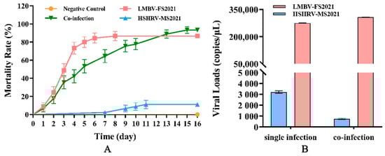 Our results confirmed that the diseased largemouth bass from the Foshan farm were co-infected with LMBV and HSHRV. To our knowledge, this is the first reported of largemouth bass being infected with both viruses. Co-infection of multiple pathogens is a very common phenomenon in aquaculture with combinations of parasites, bacteria or viruses. SCRV and ISKNV co-infections of siniperca chuatsi [], infectious pancreatic necrosis virus (IPNV) and IHNV co-infections of Oncorhynchus mykiss [] as well as infectious hypodermal and hematopoietic necrosis virus (IHHNV) and white spot syndrome virus (WSSV) in wild crustaceans [] have been reported. Together with our data that the co-infection of viruses increases virulence and poses a huge challenge to the health protection of aquatic animals, our results indicated that co-infection increased fish mortality even though viral loads differed by more than 100-fold and was a significant (p < 0.05) difference between single and co-infection. A possible explanation for these results is that LMBV replication is promoted following co-infection because we found the viral loads for LMBV in the co-infection group was significantly higher than that with LMBV alone. Previous studies have also shown synergistic actions of the two viruses significantly increase morbidity and mortality in infected fish [,]. The specific influence and mechanism of the interaction between LMBV-FS2021 and HSHRV-MS2021 awaits further study.