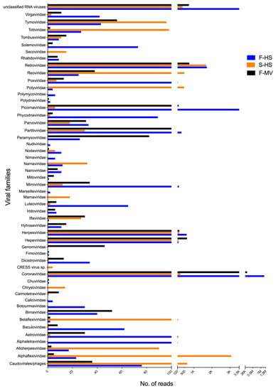 Schematic summary of the number of reads related to viruses classified by viral family at the protein level. Scale breaks were introduced in the x-axis for the visualization of the variable number of viral counts in each dataset. The exact number of viral counts are provided in Supplementary Table S1.