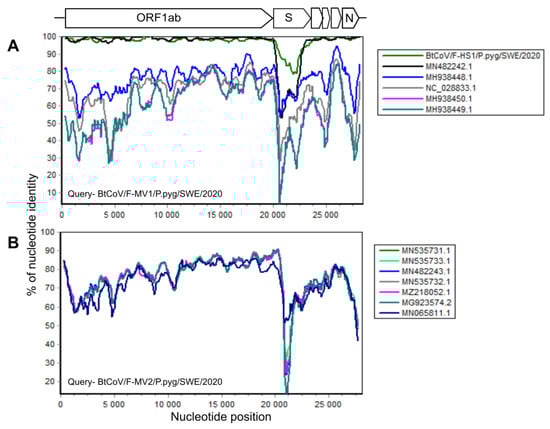Simplot analysis of Swedish bat coronaviruses. Near full-length sequences of BtCoV/F-MV1/P.pyg/SWE/2020 (A) and BtCoV/F-MV2/P.pyg/SWE/2020 (B) were used as queries and compared with closest reference sequences in the SimPlot similarity analysis. All the analyses were performed with a Kimura model, a window size of 600 base pairs, and a step size of 100 base pairs.