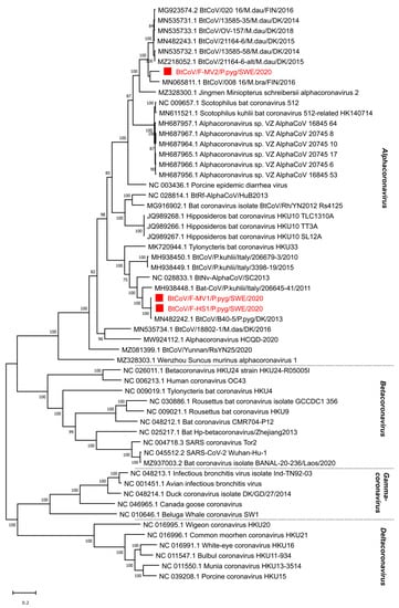 Phylogenetic analysis of coronaviruses from Sweden based on predicted full-length ORF1ab protein. The sequences reported in this study, BtCoV/F-MV1/P.pyg/SWE/2020 (ON457560), BtCoV/F-MV2/P.pyg/SWE/2020 (ON457561), and BtCoV/F-HS1/P.pyg/SWE/2020 (ON457562), (indicated by red square boxes and red text), and the closest sequence matches from Genbank and ICTV reference sequences from each genus within the Orthocoronavirinae subfamily are included in the analysis. The tree was generated using a maximum likelihood model with 500 bootstrap iterations on ClustalW-aligned amino acid sequences, with a total of 8037 amino acid positions in the final dataset. Only bootstrap values above 50 are displayed on the nodes.