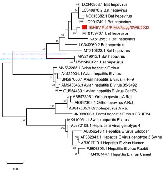 Viral reads classified as the Hepeviridae family were identified in all the pools, ranging from 148 to 627 reads. From the F-MV pool, four longer contigs were generated (BtHEV-Pp1/F-MV/P.pyg/SWE/2020, Genbank number ON513427), and these contigs showed the closest protein identity (82–96%) to the non-structural and capsid proteins of a known bat hepevirus (MT815970.1) previously identified in P. nathusii bats from Switzerland and covering approximately 85% of ORF1 in the reference genome, including the RNA-dependent RNA polymerase (RdRp) domain. No contigs related to hepeviruses could be assembled from S-HS and the F-HS pool. The multiple sequence alignment and phylogenetic analysis using the conserved RdRp protein from other hepeviruses in the family showed that the identified sequence clustered with bat hepeviruses and closely with P. nathusii bat hepevirus (Figure 5).