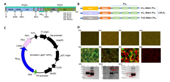 Schematic representation of GP-PA binding with GEM particles was shown in Figure 2A. The surface location of GPLP3 (eGNLP3, eGCLP3, NAbLP3) fusion proteins on GEM particles, which were confirmed by SDS-PAGE, Western blot and immunogold electron microscopy (IEM).