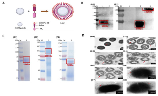 Western blot analysis with antibody demonstrated that binding to the 55KDa, 100 KDa and 50 KDa were recombinant proteins, and no expression of any immune reactivity protein was detected in mock preparations (Figure 2(B1,B2)). Analysis by SDS-PAGE revealed that three recombinant proteins with the expected apparent molecular weight of approximately 55 KDa, 100 KDa and 50 KDa, respectively (Figure 2(C1–C3)). All target proteins are boxed out in red. In addition, IEM analysis exhibited that the elliptical shape of GEM particles could be clearly observed with evident surface gold particles, which strongly indicated that the G-GP (G-eGN, G-eGC, G-NAb) fusion proteins successfully were displayed on the surface of GEM particles (Figure 2(D6–D8)).
