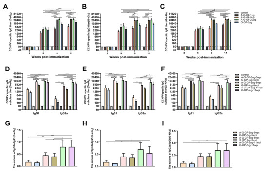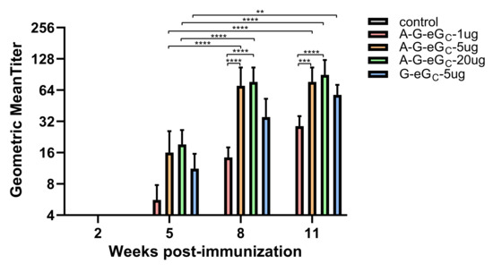 Comparison of the serological responses in BALB/c mice subcutaneously immunized with G-GP vaccines against CCHFV. Booster doses were given at 3, 6 and 9 weeks after the first immunization, and virus-specific antibodies in mice were assessed at 2, 5, 8, 11 weeks after the first immunization. The results were recorded as the geometric mean titer (GMT) ± the standard error (S.D.).