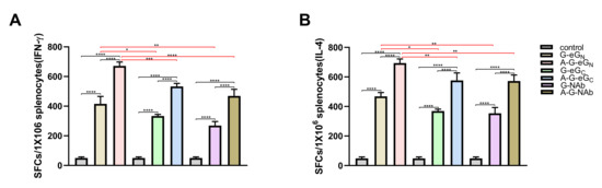 To further investigate antigen-specific cellular immune responses, the secretion of IFN-γ and IL-4 by mouse splenocytes was measured by ELISpot assay. In Figure 6A,B, the ELISpot assay showed that the amount of splenocytes secreting IFN-γ and IL-4 from mice immunized with 5 μg A-G-GP or 5 μg G-GP alone was significantly higher than from mice in the control group, suggesting 5 μg G-GP could increase in production of this cytokine. Additionally, the secretion of IFN-γ and IL-4 by splenocytes from mice in A-G-GP group were significantly strong than that from mice in G-GP group, indicating that the 201 + polyI:C adjuvant could significantly enhance cellular immune responses. In addition, the A-G-eGN and G-eGN vaccines were capable of producing significantly higher numbers of IFN-γ and IL-4 SFCs, when compared with the numbers observed for the A-G-eGC, G-eGC, A-G-NAb and G-NAb vaccines (Figure 6A,B), suggesting the A-G-eGN and G-eGN vaccines could elicit a stronger T-cell response. Together, our ELISpot data demonstrated that the G-GP vaccine induced CCHFV-specific IFN-γ and IL-4 recall responses against three vaccine antigens. As a negative control, we included naive splenocyte cells from GEM + 201 + polyI:C immunized negative control mice.