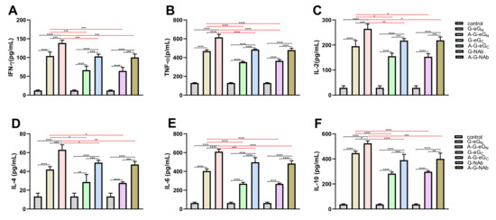 Mouse ELISA cytokine kits (MABTECH, Nacka, Sweden) were applied to detect the levels of the cytokines Th1 (IFN-γ, TNF-α, IL-2) and Th2 (IL-4,6,10) in supernatants of stimulated splenocytes, which were harvested 14 days after the third immunization from mice immunized with 5 μg A-G-GP or 5 μg G-GP; collected splenocytes were spread at 2.5 × 105 cells/well into 96-well plates and were stimulated with purified eGN or NAb antigen (10 μg/mL) produced in E. coli for 72 h at 37 °C and 5% CO2. According to the manufacturer’s instructions, IL-2,4,6,10, IFN-γ, and TNF-α levels in supernatants were analyzed.