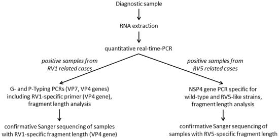 Therefore, a PCR-based algorithm including sensitive and highly specific PCRs was developed to identify RVA infections and to distinguish wild-type RVA strains from vaccine-like strains in human specimens, even in mixed infections.