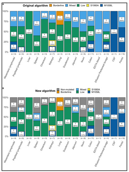 Summary of the results of the commercial real-time feline coronavirus (FCoV) 7b gene and spike (S) gene mutation reverse transcription polymerase chain reactions (RT-qPCR) following following the original algorithm (A) and the new algorithm (B) in all tissue, fluid, and fecal samples from the 21 cats positive for FCoV RNA in at least one sample. M1058L = positive FCoV S gene mutation RT-qPCR detecting mutation in nucleotide 23,531, corresponding to amino acid substitution M1058L; S1060A = positive FCoV S gene mutation RT-qPCR detecting mutation in nucleotide 23537, corresponding to amino acid substitution S1060A; Low = positive FCoV 7b gene RT-qPCR with viral load below cut-off (therefore no further differentiation possible by FCoV S gene mutation RT-qPCR); Mixed = positive FCoV 7b gene RT-qPCR and presence of FCoV with and without S gene mutations; Borderline = a specific PCR product (amplicon) could neither be detected with certainty nor could its presence be ruled out; EDTA = ethylenediamine tetra acetic acid; CSF = cerebrospinal fluid.